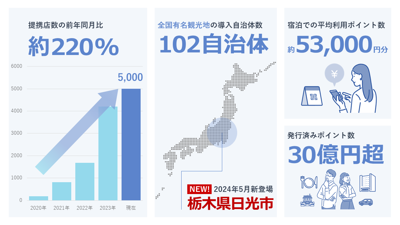 「ふるなびトラベルポイント」の提携店が2024年5月15日に前年同月比約220%に増加し、5,000件を突破しました。これにより、全国の観光地でふるさと納税による集客を実現しています。