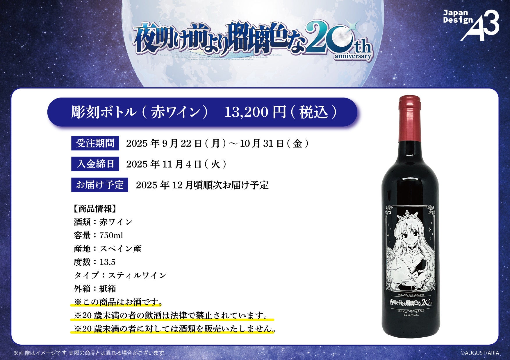 中身の赤ワインを堪能しつつ、月を眺めてこの20年間の思い出を振り返ってみてはいかがでしょうか? また、赤ワインを飲みほしたあとは “彫刻ボトル“という大人ならではのアイテムをお部屋に飾って、これからも『夜明け前より瑠璃色な』を応援し続けましょう!