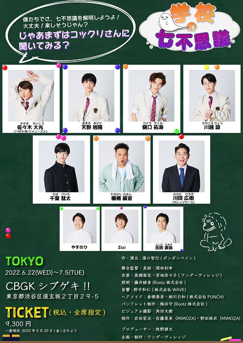 株式会社ワンダーヴィレッジ(東京都港区、プロデューサー牧野健太)主催による『学校の七不思議』が2022年6月22日(水)~7月5日(火)にCBGKシブゲキ!!(東京都渋⾕区)にて上演されます。チケットはカンフェティ(運営:ロングランプランニング株式会社、東京都新宿区、代表取締役:榑松 ⼤剛)にて2022年5月20日(金)12:00より一般発売開始予定です。