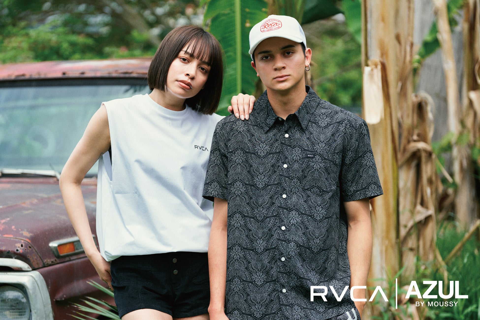 アート、スケートボード、サーフィン、格闘技という4つのカルチャーをルーツに持つ、カリフォルニア発のライフスタイルブランド「RVCA(ルーカ)」と、「AZUL BY MOUSSY(アズール バイ マウジー) 」とのコラボレーションアイテムの2025年サマーコレクションは、RVCAの象徴的なロゴやグラフィックを配したユニセックス仕様のアイテムのラインナップで登場。