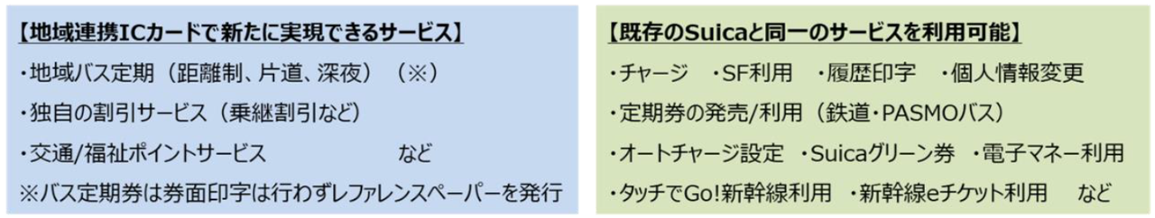 地域連携ICカードは、東日本旅客鉄道株式会社が提供する、地域のバス事業者が運行するバスの定期券や各種割引など地域独自サービスの機能に加えて、SuicaエリアおよびSuicaと相互利用を行っているエリアで利用可能な乗車券や電子マネーなどのSuicaのサービスが1枚でご利用いただける2in1カードです。地域連携ICカードの概要及び導入状況に関しては、別紙をご参照ください。