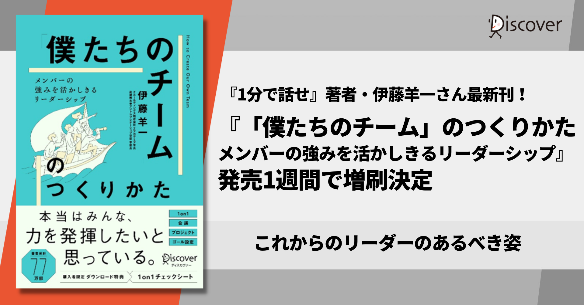 株式会社ディスカヴァー・トゥエンティワン(本社:東京都千代田区、取締役社長:谷口奈緒美)は2022年11月18日刊行の『「僕たちのチーム」のつくりかた メンバーの強みを活かしきるリーダーシップ』(伊藤羊一・著)を増刷しました。