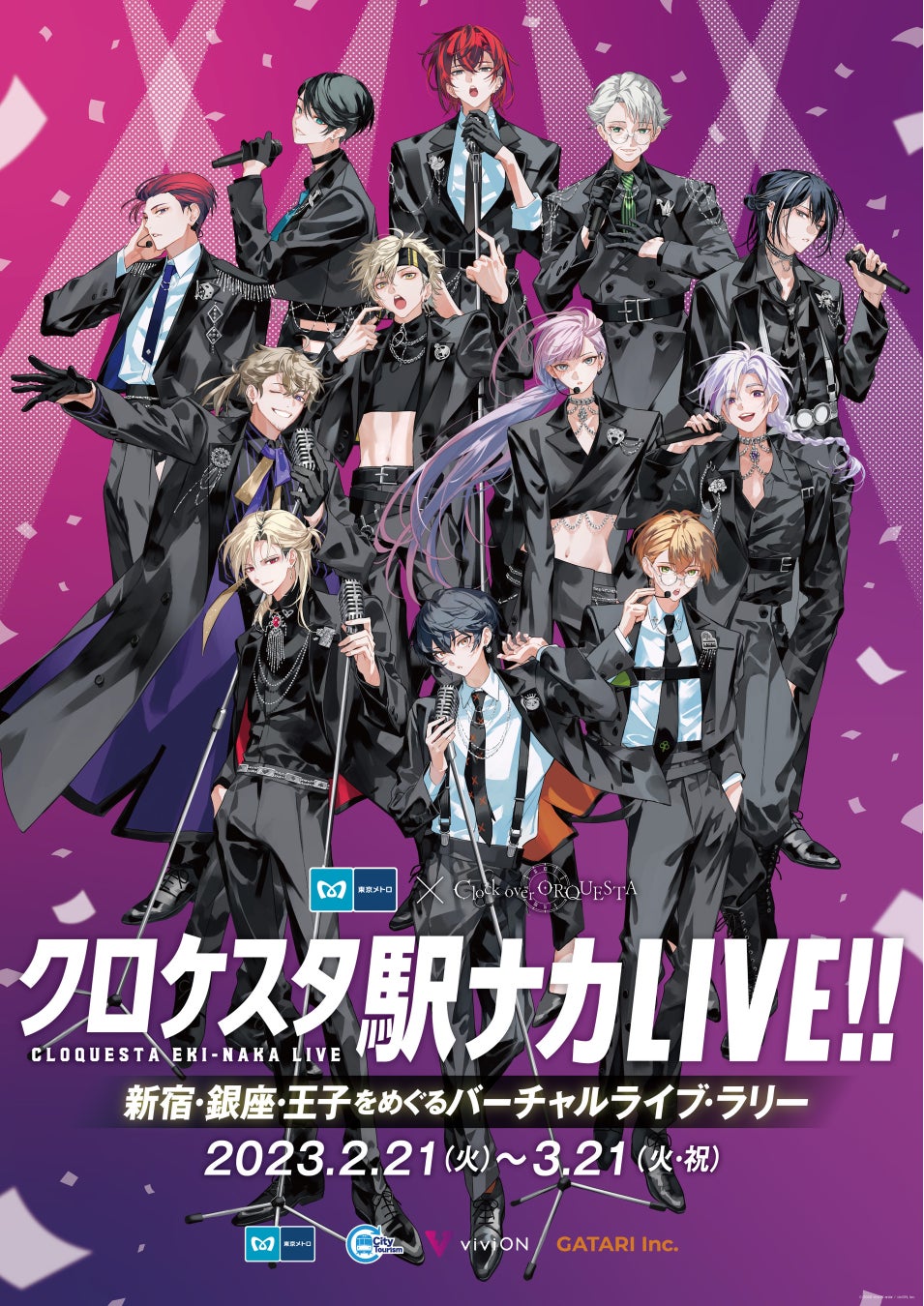 東京地下鉄株式会社(本社:東京都台東区、代表取締役社長:山村 明義、以下「東京メトロ」)、株式会社viviON(本社:東京都千代田区、代表取締役:明石 耕作、以下「viviON」)及び株式会社GATARI(本社:東京都千代田区、代表取締役:竹下 俊一、以下「GATARI」)は、東京メトロ×Clock over ORQUESTA「クロケスタ駅ナカLIVE!!〜新宿・銀座・王子をめぐるバーチャルライブ・ラリー〜」を2023年2月21日(火)から3月21日(火・祝)まで開催します。