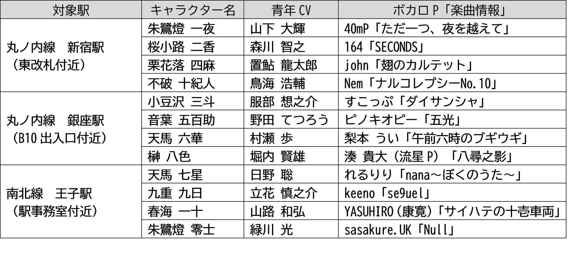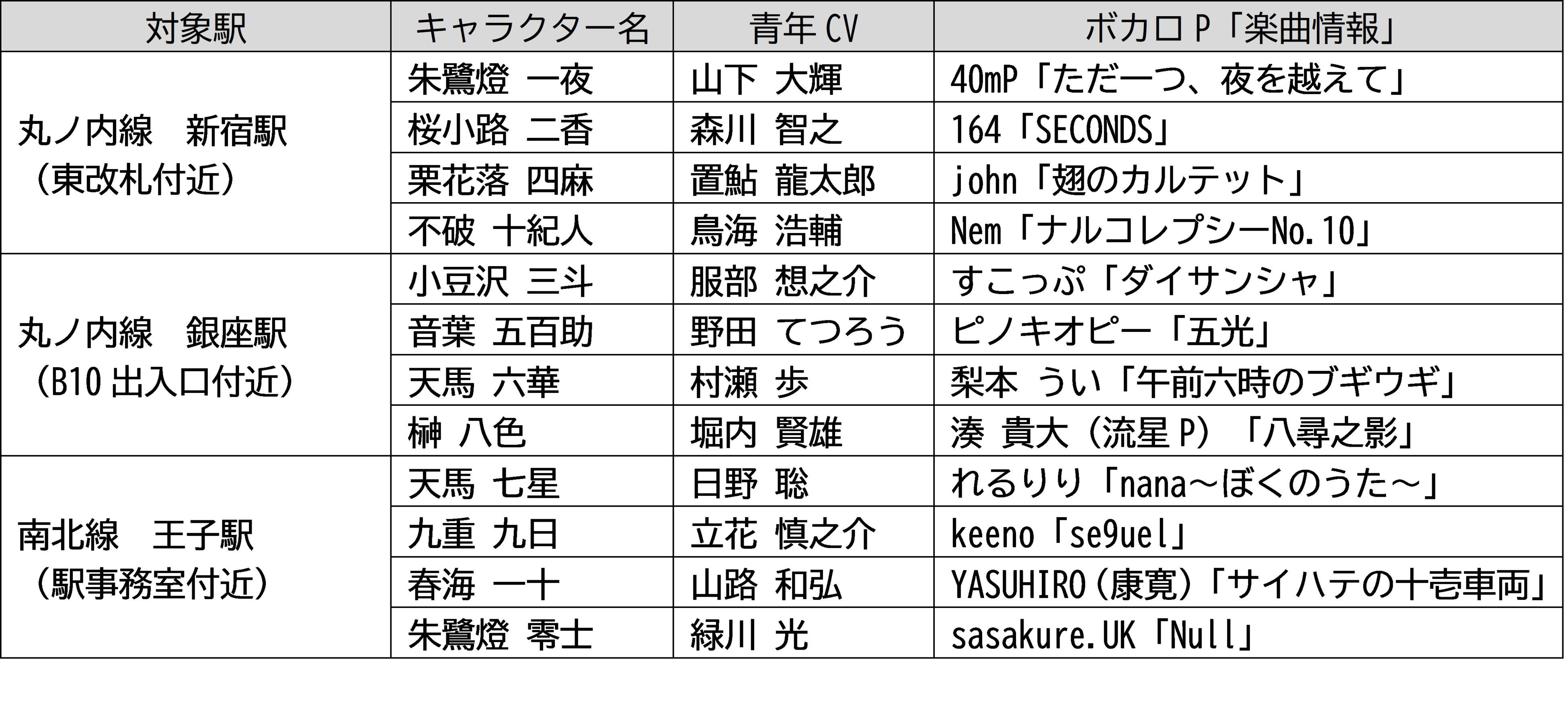 4 対象駅とライブスポット(キャラクター名/青年CV(Character Voice)/ボカロP「楽曲情報」)