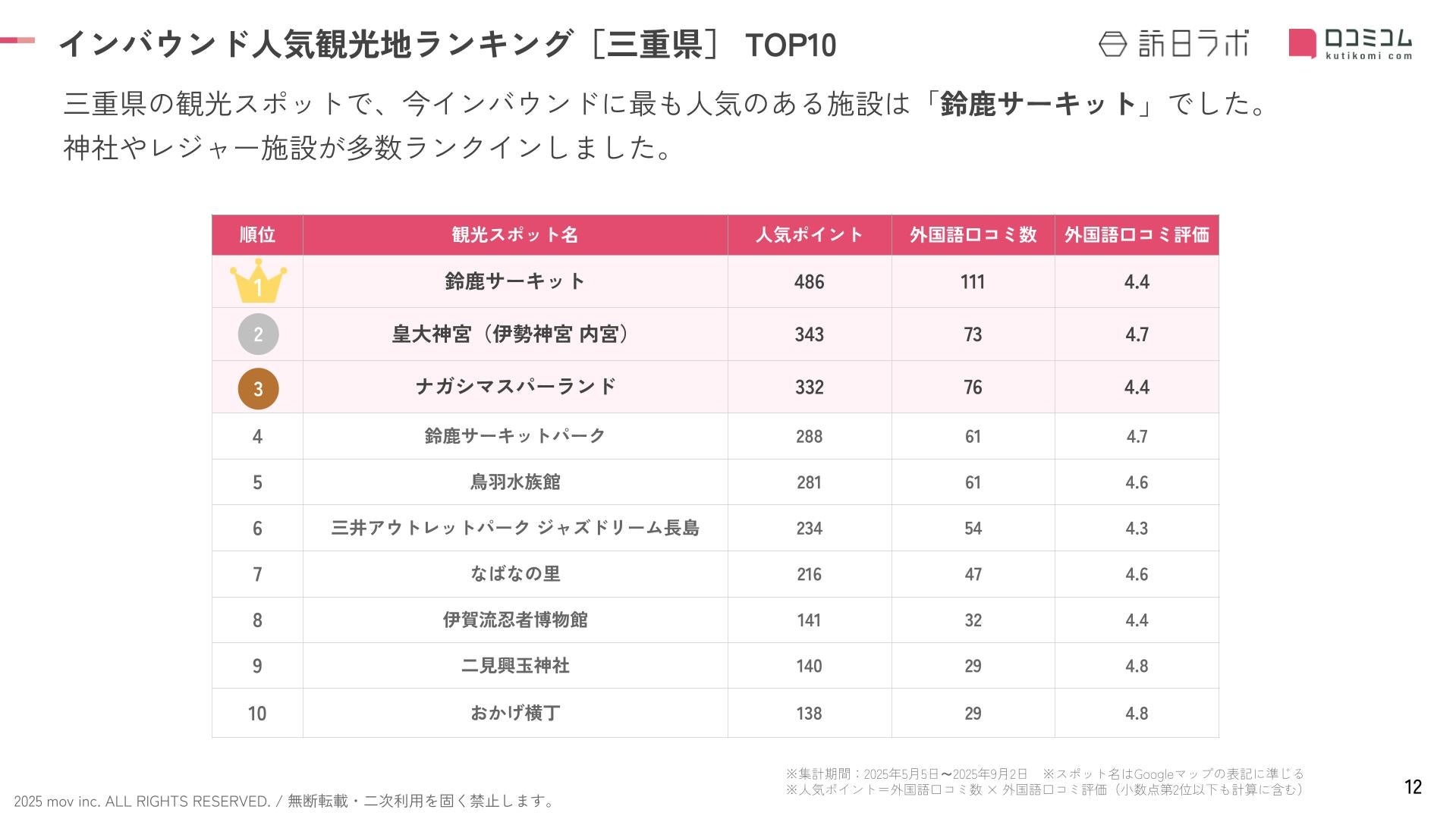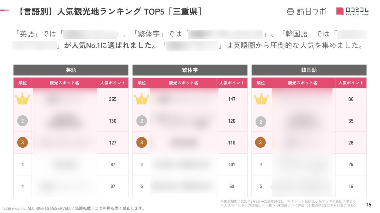 業界最大級のインバウンドビジネスメディア「訪日ラボ」及び 店舗向け集客一元化プラットフォーム「口コミコム」を運営する株式会社mov(代表取締役:渡邊 誠、本社:東京都渋谷区、以下mov)は、三重県の観光地に寄せられた最新の口コミデータから、独自の『インバウンド人気観光地ランキング』を発表しました。