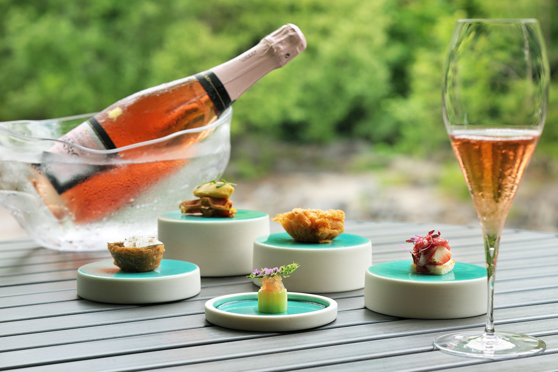 当レストランでは、渓流沿いのテラス席と奥入瀬渓流の自然をイメージしたダイニングで、渓流の自然に癒されながらゆっくりと食事を味わえます。渓流沿いに設けられたアペリティフを楽しむテラス席は、奥入瀬渓流を一望でき、瀬音を全身で感じられる、広々とした開放的なつくりです。春の爽やかな新緑、夏の鮮やかな深緑、秋の錦絵のような紅葉、冬の幻想的な銀世界など、四季折々の美しさをゆったりと楽しめます。渓流の瀬音に耳を傾けながら、アミューズとシャンパーニュの奥深いマリアージュを味わう時間は、この上ない贅沢です。ダイニングにも、大きな窓を設え、新緑や紅葉、雪などの四季折々の景色が、時間が経つにつれてゆっくりと夜の暗さに溶け込んでいきます。奥入瀬渓流の美しい景色を眺めながらゆっくりと食事を味わい、特別なひとときを過ごせる空間です。