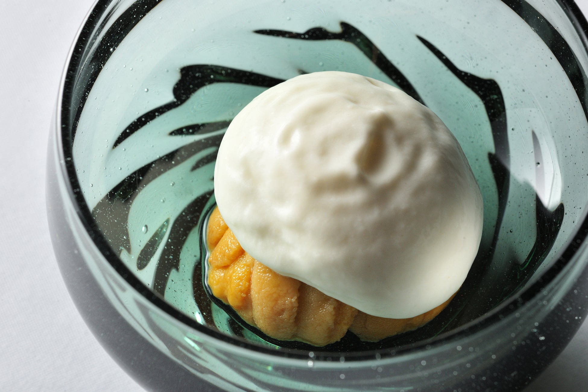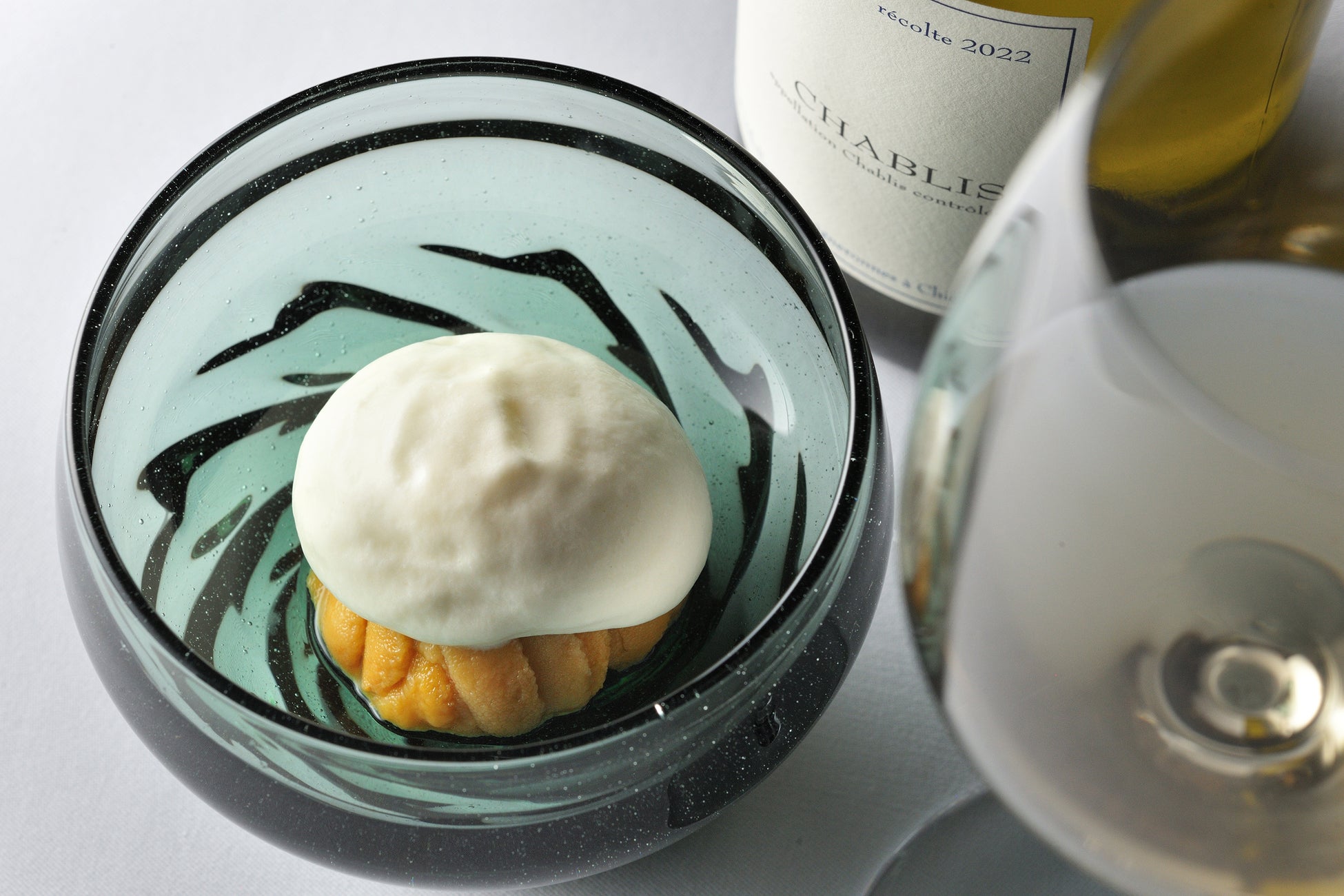 「いちご煮」とは、青森県南部地方の太平洋沿岸地域で受け継がれる郷土料理です。本来のいちご煮は、魚介の旨味が溶け込む白色の汁に、新鮮な雲丹と鮑の身が入った、素材を味わう潮汁です。そんな地域で親しまれる食文化を尊重しながら、お茶のジュレや貝出汁のムースなど、フランス料理の技法を用いて新たな一品へと昇華させました。簑原の手がけるいちご煮は、濃厚な貝の旨みを感じながらも、あしらわれた青紫蘇のオイルと葉で、爽やかに味わえます。夏らしくも青森の食文化を活かした、心躍る一皿です。