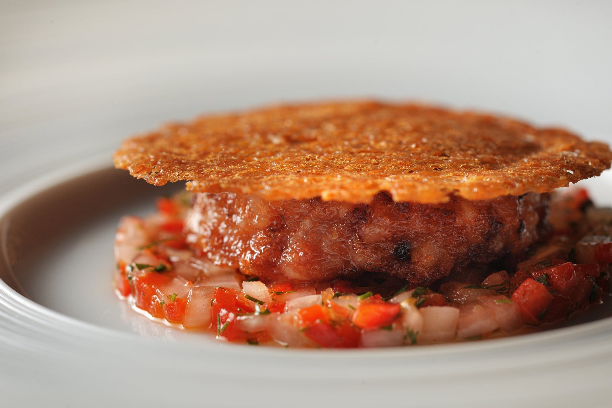 津軽地方内陸部では烏賊を刺身にしたときに残るゲソを野菜とともに揚げた家庭料理「イガメンチ」が親しまれています。食材を無駄なく使うイガメンチは、津軽内陸部では貴重な海の幸を大切に食べる、津軽地方の食文化です。地元で大切にしている文化を尊重しながら、烏賊の胴体やゲソを余すことなく使用し、簑原らしいアレンジで、新たな料理に仕上げました。生ハムの旨味を効かせたパプリカのピュレと、ビネガー、ハーブの香り豊かなチュミチュリソース(*1)、食感のコントラストを楽しめる干し烏賊のチュイルで仕立てました。サクッとした食感のコントラストを楽しみながら烏賊の香ばしさと旨味を存分に堪能できる一皿です。