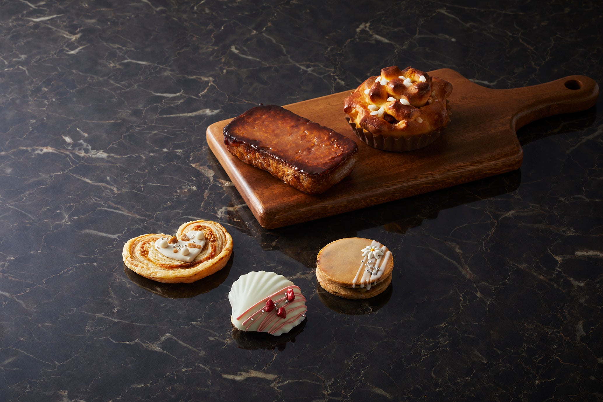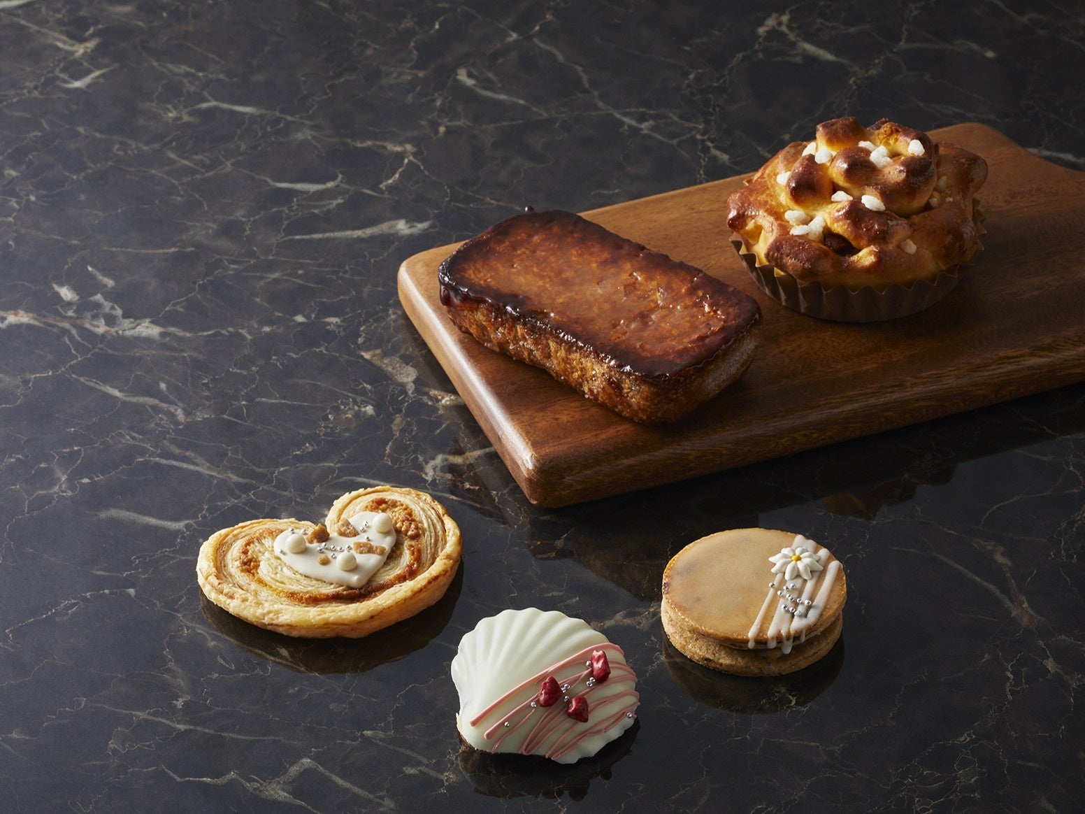 “パルミエ”は、メープルとアーモンドの豊かな味わいが美味しいサクサク食感のパイ。ホワイトチョコでコーティングされた“マドレーヌ”は、レモンの花から採れたはちみつと、すりおろしたレモンの皮を生地に練り込み、レモンの香りと風味が広がる一品に仕上げました。“キャラメルガナッシュのクッキーサンドショコラ”は濃厚なキャラメルチョコとダークチョコのガナッシュクリームをクッキー生地でサンド。クッキー生地はラム酒の香りをまとったサクッとした食感です。
