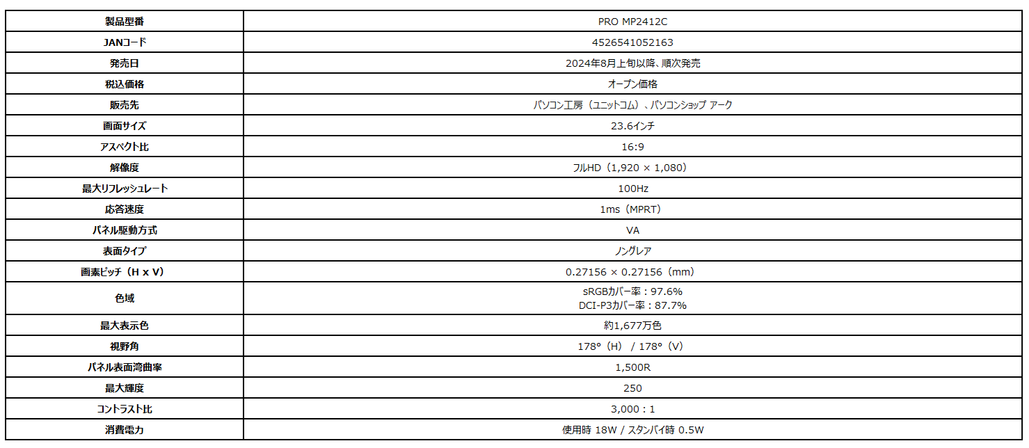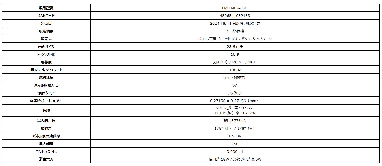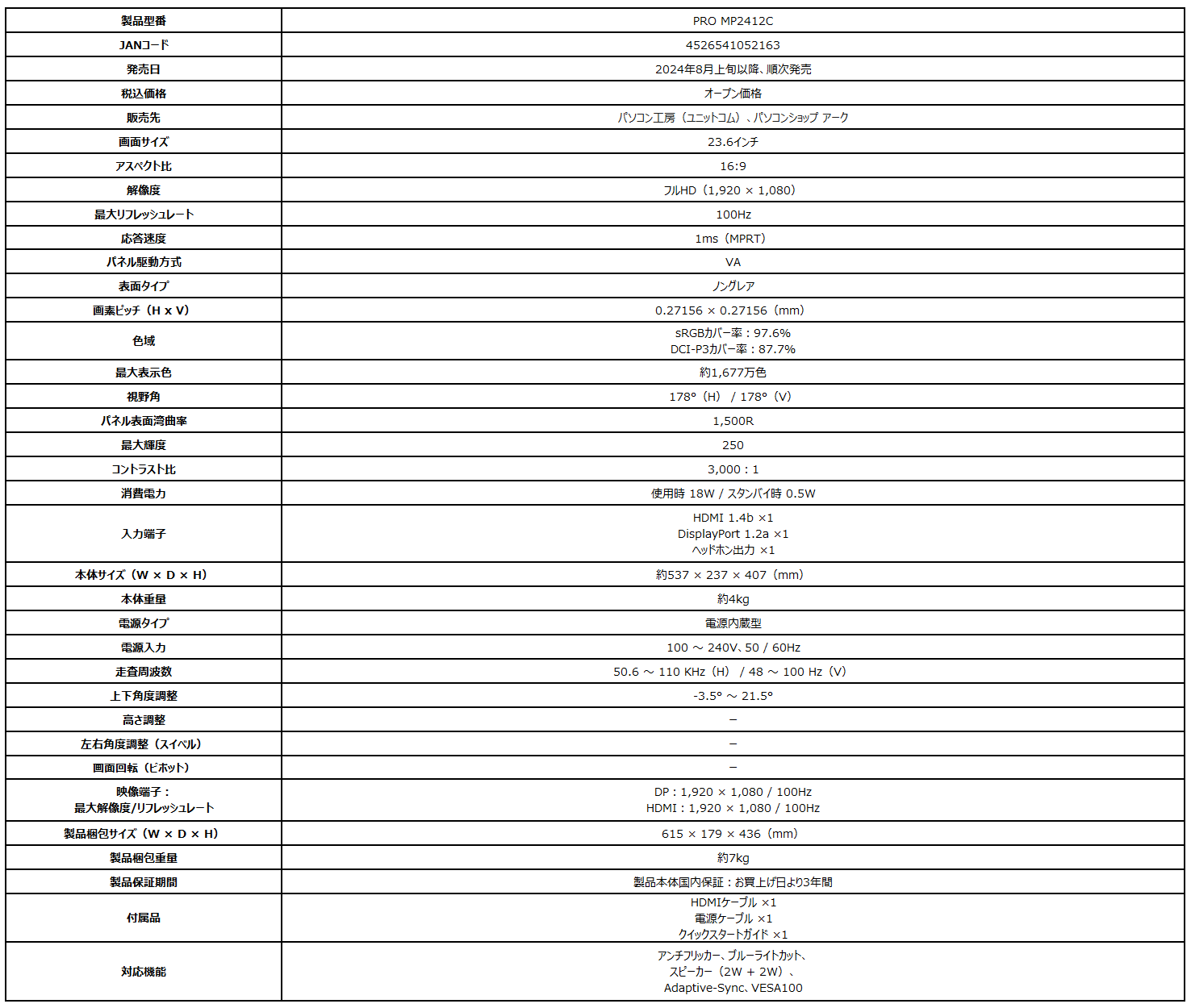 世代を問わずに使用できる目に優しい湾曲モニター23.6インチ・フルHD・スクロール時も見やすいリフレッシュレート100Hzユニットコム専売モデル「PRO MP2412C」発売