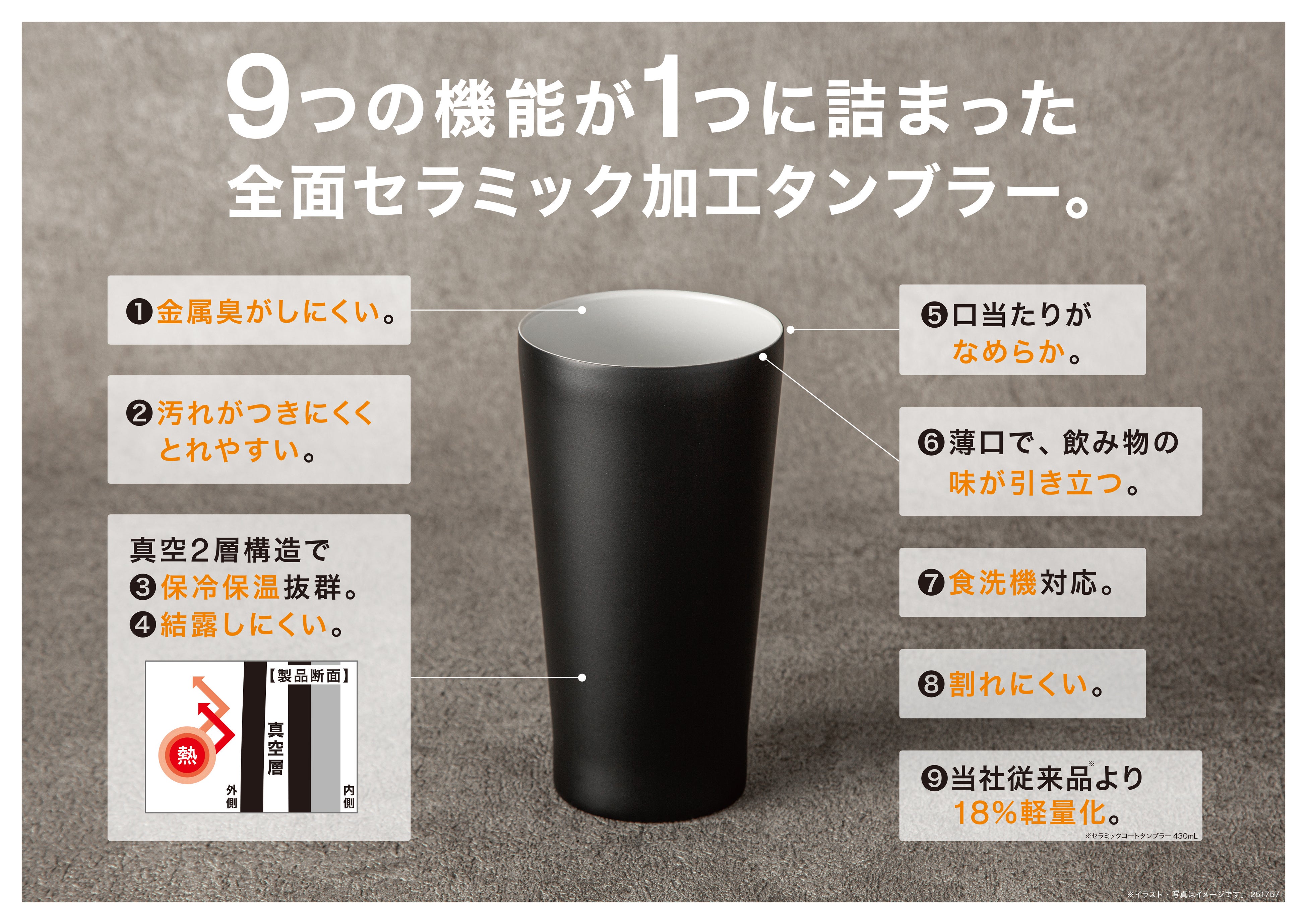 今回販売を開始したセラミックコートタンブラー最大の特徴は「食洗機で洗えること」です。従来の商品は食洗機で洗うと底面の保護シートが剥がれてしまうため、手洗いが必要でした。今回の商品はシートを溶接する加工を施し、食洗機で洗える仕様に改良しています。