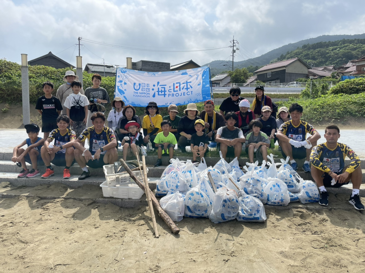 ごみ拾いでは、選手と参加者が真夏の海水浴場で、ごみ拾いに汗を流しました。今年は新型コロナウイルス感染拡大の影響で、海水浴場としては開場されていないため、多くのごみが散乱。大きな流木やプラスチック製の大きなトレイなども落ちていて、約1時間をかけ20袋以上のごみを回収しました。