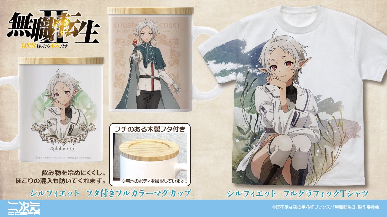 『無職転生Ⅱ ~異世界行ったら本気だす~』より、水彩絵具風に「シルフィエット」をあしらったフルグラフィックTシャツと、木製のフタ付きで便利なフルカラーマグカップが二次元コスパから登場。