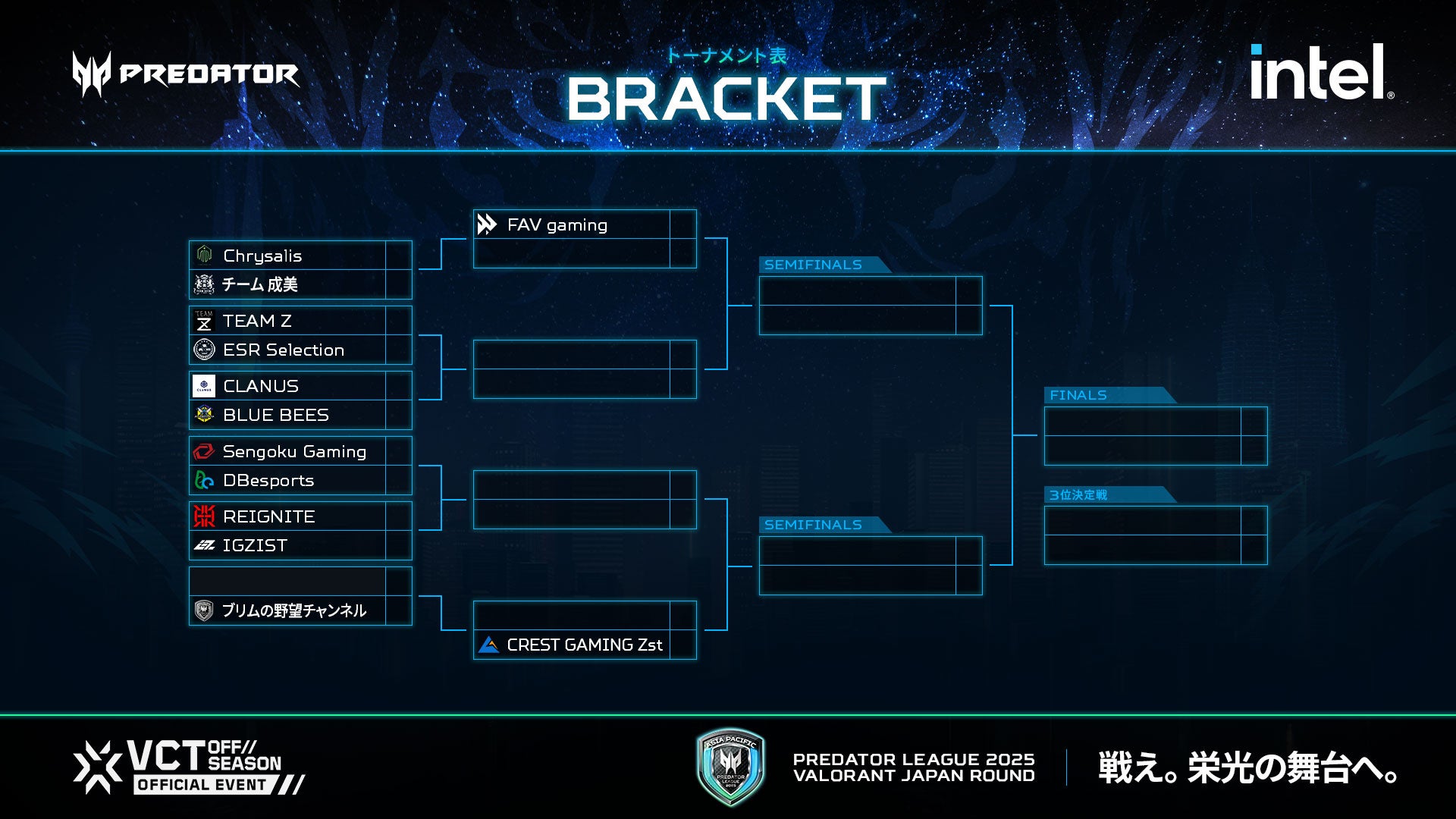 本大会は下記の組み合わせで実施されます。1回戦にエントリーされていた1チームより出場辞退がなされたため、プリムの野望チャンネルは不戦勝となります。直前の変更となったため、他のチームの組み合わせは行いません。昨年度2024日本予選の実績から、FAV gaming および CREST GAMING Zstは2回戦からの出場となります。