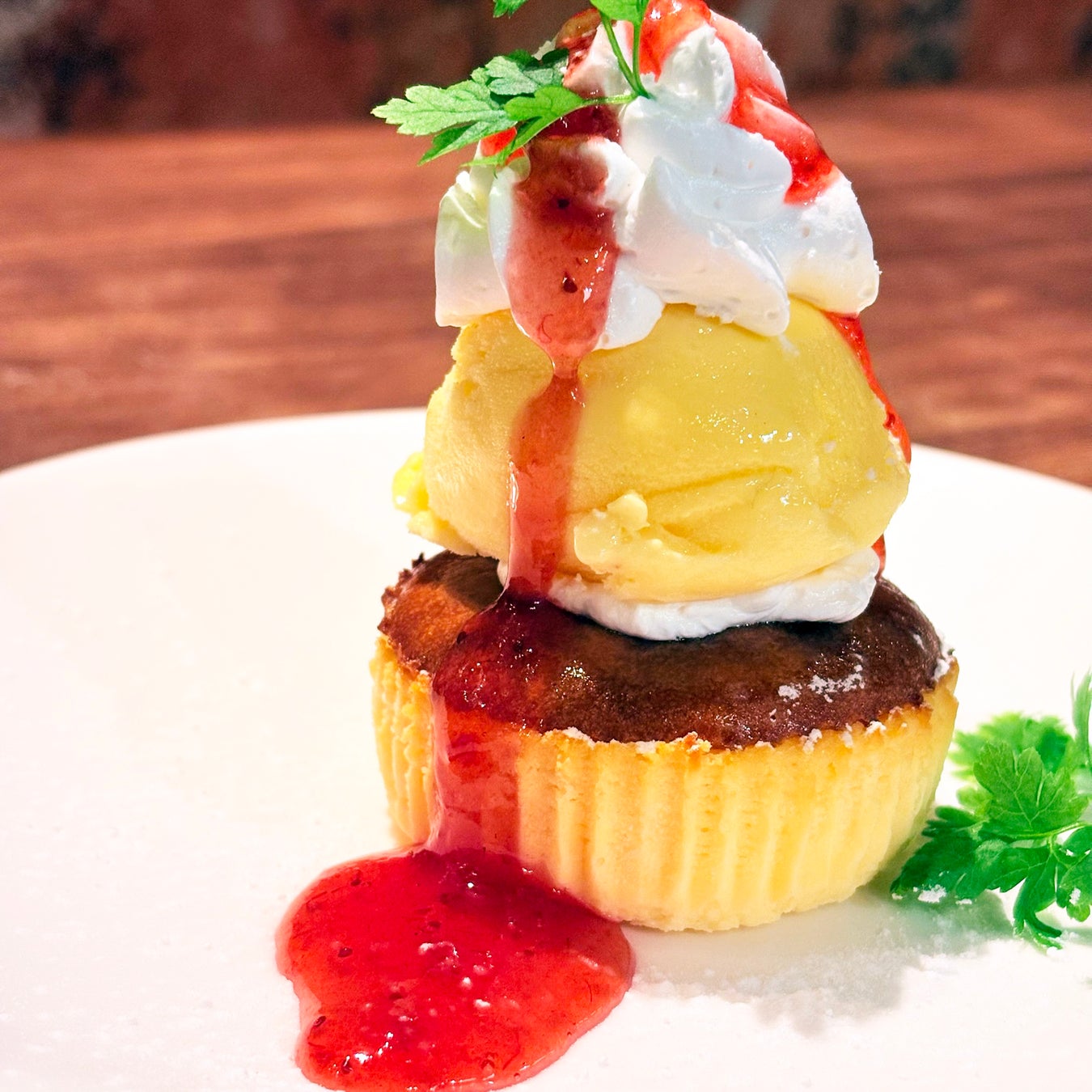 しっとり濃厚なバスクチーズケーキに、なめらかなバニラアイスを重ね、甘酸っぱいストロベリーソースを添えました。