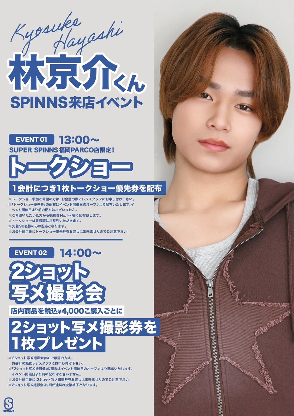 若者向けアパレル事業を中心に展開する、株式会社ヒューマンフォーラム(本社:京都市中京区 代表取締役会長:出路雅明)が運営する「SPINNS(スピンズ)」が大人気恋愛リアリティ番組に出演し話題沸騰中の「林 京介くん」との追加イベントを実施致します。