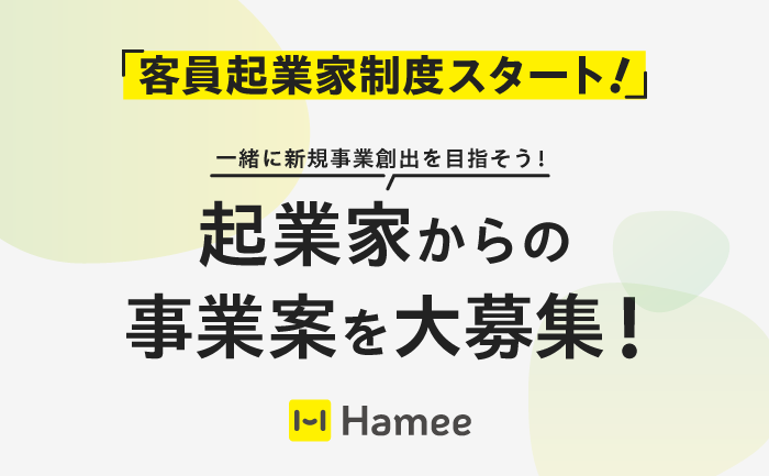 起業経験者や起業を準備している方を対象に、客員起業家として当社に参加いただくことで、当社のリソースやナレッジを活用することが可能です。Hameeのビジョンに共感いただいた熱量の高い起業家からの募集をお待ちしています。