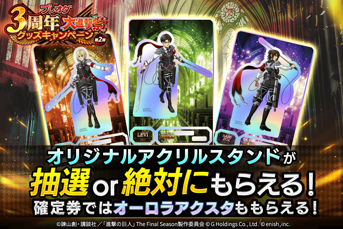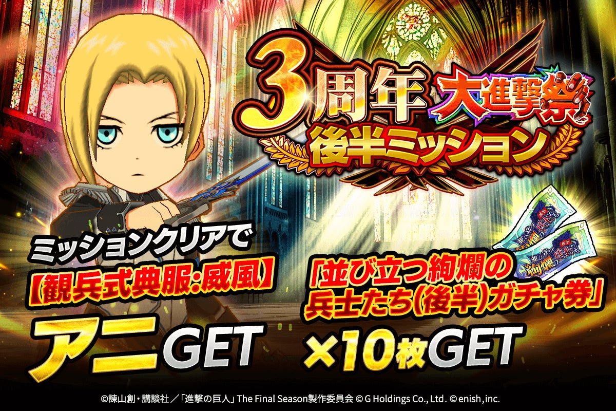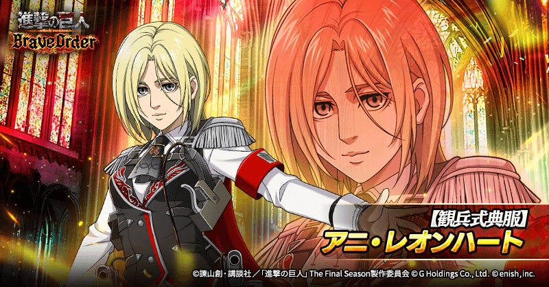 株式会社enish(本社:東京都港区、代表取締役社長:安徳 孝平、以下enish)は、アニメ『進撃の巨人』のスマートフォンゲーム最新作「進撃の巨人Brave Order」にて、2025年2月18日(火)より、ブレオダ3周年大進撃祭後半を開催!今ならガチャなどに使用できる赤輝石が最大6,000個もらえちゃう!またブレオダ3周年大進撃祭後半ミッションではアニの特別な衣装がGET可能!その他、最新情報はゲーム公式サイト・ゲーム公式X(旧Twitter)アカウントにて随時公開して行きますので、ぜひご覧ください。