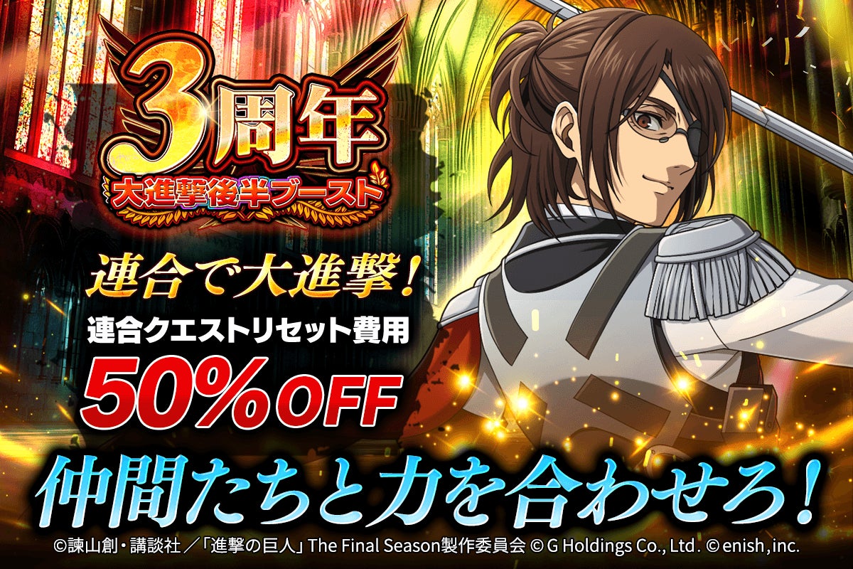 2025年2月18日(火)より、団員の連合クエストのリセット費用が半額になる3周年大進撃後半ブーストを開催!仲間と力を合わせて報酬をGETしよう!