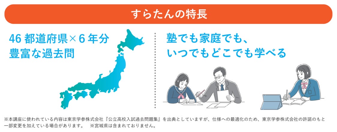 導入実績2000超を誇るeラーニング専門ソリューション企業、株式会社デジタル・ナレッジ(本社:東京都台東区、代表取締役社長:はが弘明)は、学習塾でのご利用に最適なデジタル教材「すらたん数学」を正式リリースいたしました。46都道府県の過去問6年分豊富な過去問を収録。数学力の大幅な向上を目指すことができます。今回のリリースを記念して「すらたん数学」にお申込みいただいた方には、数学のコンテンツ料を初月無償*でご提供いたします。