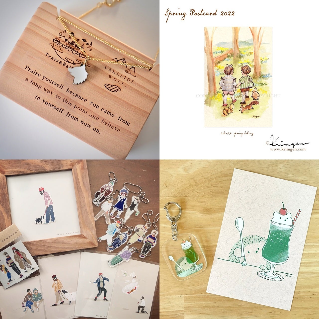 【左下】「Muga Kawakami」額装イラスト8,250円、キーホルダー660円、ステッカー440円、ポストカード165円