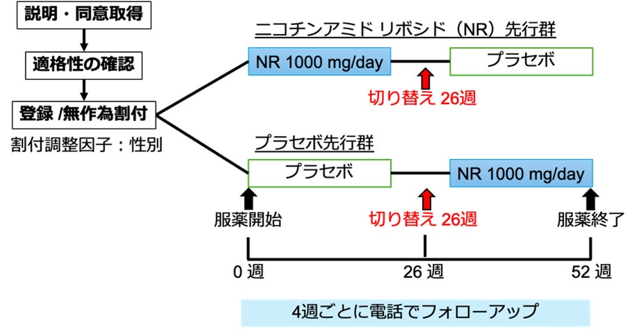 本研究では、ウェルナー症候群の患者さんに対するNAD⁺前駆体であるNRの安全性及び有効性の検討を行いました。試験デザインは、NRを1日1000mg投与、あるいはプラセボ(注4)を26週投与後に他方の薬剤に切り替え、さらに26週間投与するクロスオーバー試験でした(図2)。