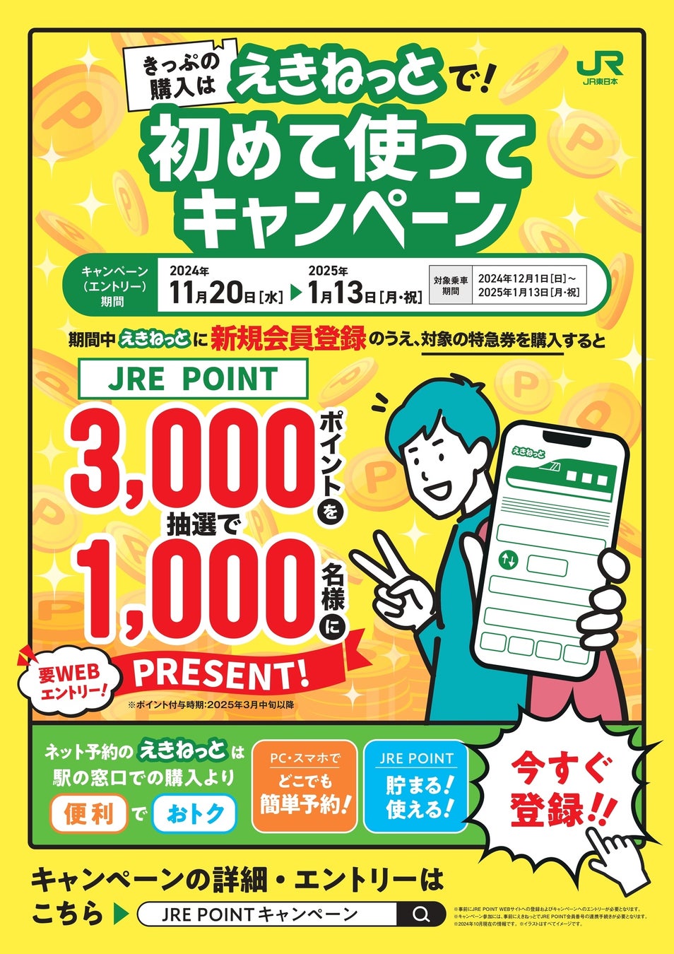 エントリー期間中に「えきねっと」に新規会員登録(無料)いただき、対象乗車期間の特急券※を「えきねっと」で購入すると抽選で1,000名に3,000円相当のJRE POINTをプレゼントします。