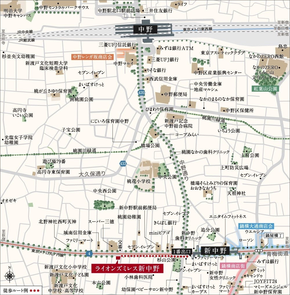 「ライオンズミレス新中野」は、東京メトロ丸ノ内線「新中野」駅徒歩4分、JR総武線「中野」駅徒歩12分と2駅4路線が利用可能で、「新宿」駅まで4分、「東京」駅まで17分と都心へのアクセスが良好です。周辺は、昔ながらの商店街が残る住環境でありながら、「中野」駅北口では”文化を原動力とした中野100年のまちづくり”として文化・芸術等のコンテンツ発信のための再開発が進むなど、今後も街の魅力が高まることが期待されます。