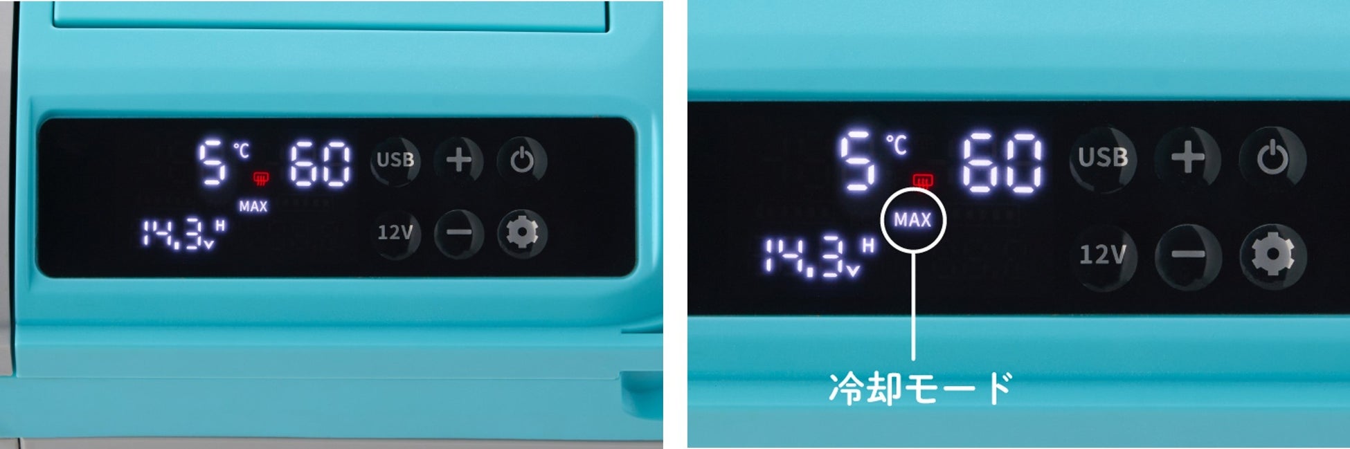 シンプルな操作スイッチで設定温度の調節も簡単。冷却モードは、フルパワーで急速に冷却する急速モード(MAX)と、消費電力を抑えながらゆっくり冷却する節電モード(ECO)の2種類から選択可能。