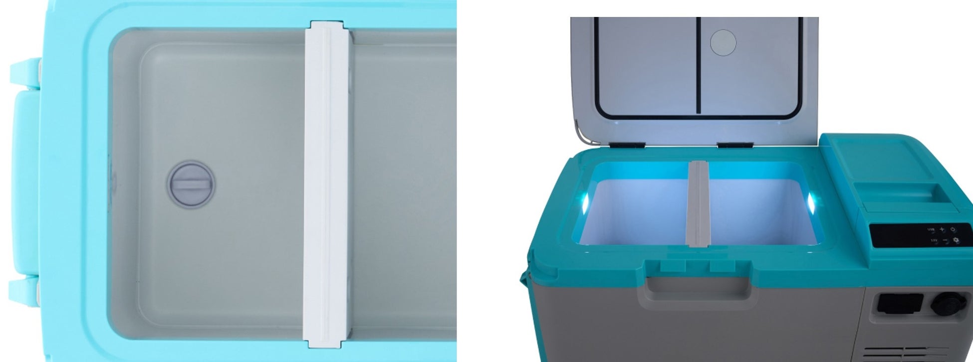 仕切りを外した約27Lの広々とした状態では、2Lのペットボトルが縦置きで最大6本収納可能で、食材や飲料をまとめて保存できる。電源接続時には、USB出力ポートやシガーソケットポートからスマートフォン等の外部機器への充電可能。