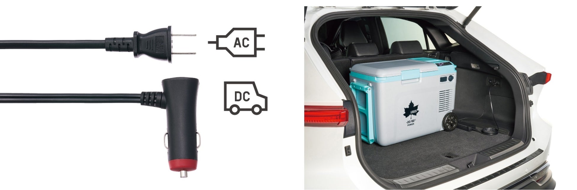 家庭用コンセントでも使えるAC電源と、車のアクセサリーソケットから給電できるDC電源の両方に対応。ポータブル電源の使用も可能で、屋内外問わず保冷保温庫として活躍。また、車載バッテリー保護機能付きで、電源の電圧が低下すると自動的に保冷が停止するので、バッテリー上がりの心配が無く、ドライブ中も安心。