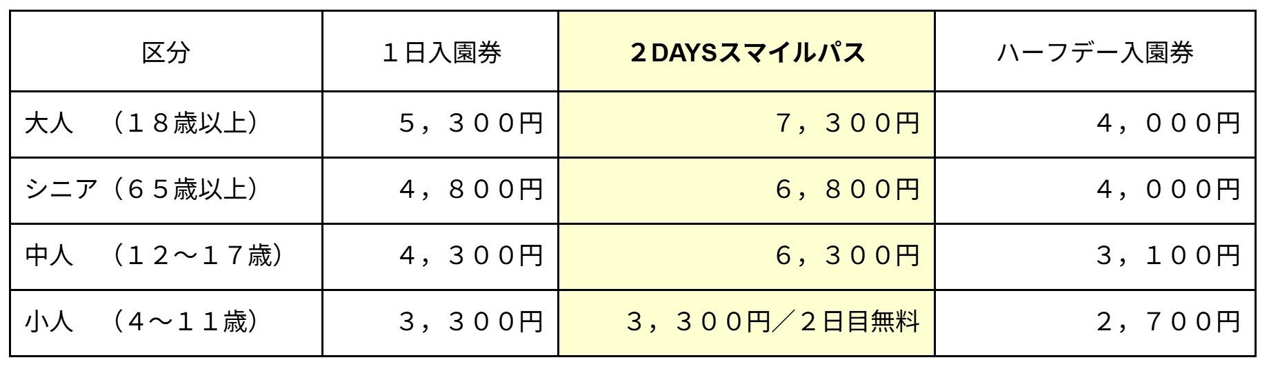 この夏、お子さまは1日入園券で2日目は無料でお楽しみいただくことができ、大人も1日入園券+2,000円で2日目が楽しめます!1日で遊び足りなかった方も、お帰りの際に「2DAYSスマイルパス」にアップグレードが可能です。