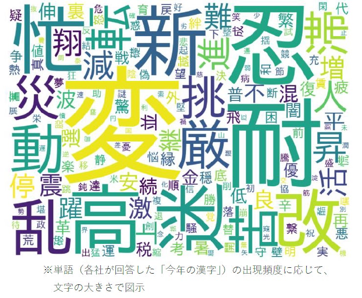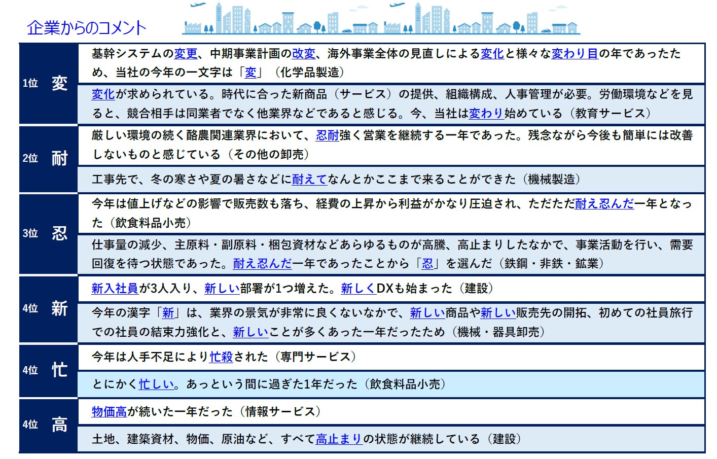 4位は、新商品や新入社員、新事業、新拠点など新たな挑戦を表す「新」のほか、「忙」と「高」が並んだ。「経済の回復に後押しされ、多くの新たなチャレンジができた一年」(金融)や、「この一年、業務は多忙を極め嬉しい悲鳴となった」(専門サービス)、「原料高や人件費高、物価高、株高だったため」(飲食料品小売)といった声が聞かれた。