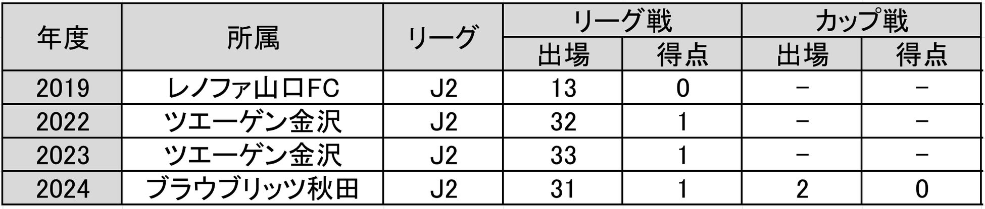 聖隷JFC - ジュビロ磐田U-18 - 流通経済大学 - 流経大ドラゴンズ龍ヶ崎 - レノファ山口FC - UDオリヴェイレンセ(ポルトガル) - ツエーゲン金沢 - ブラウブリッツ秋田(期限付き) - ツエーゲン金沢