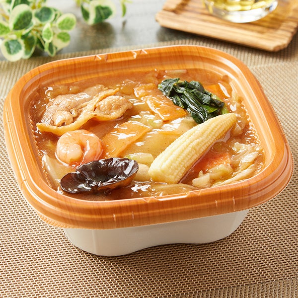 【内容】ヤングコーンなど7種の野菜を使用し、シャキシャキとした食感が楽しめる中華丼です。中華湯や帆立、オイスターなど鶏と魚介のだしの旨味が感じられる仕立てです。