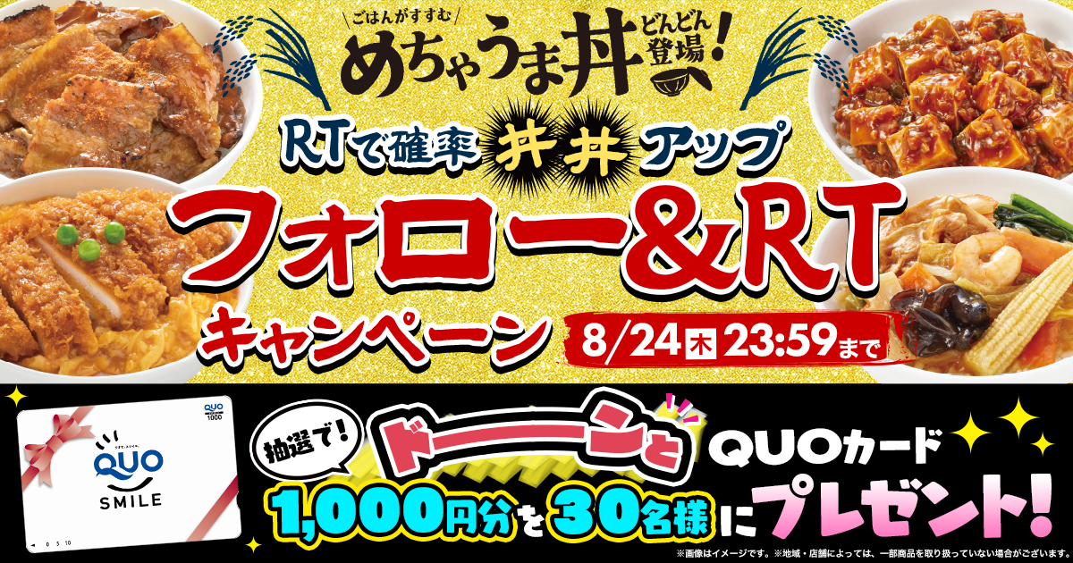期間中に対象のTwitterをRTするほど、「丼」だけに、当選確率が丼丼(どんどん)アップするキャンペーンとなっています。