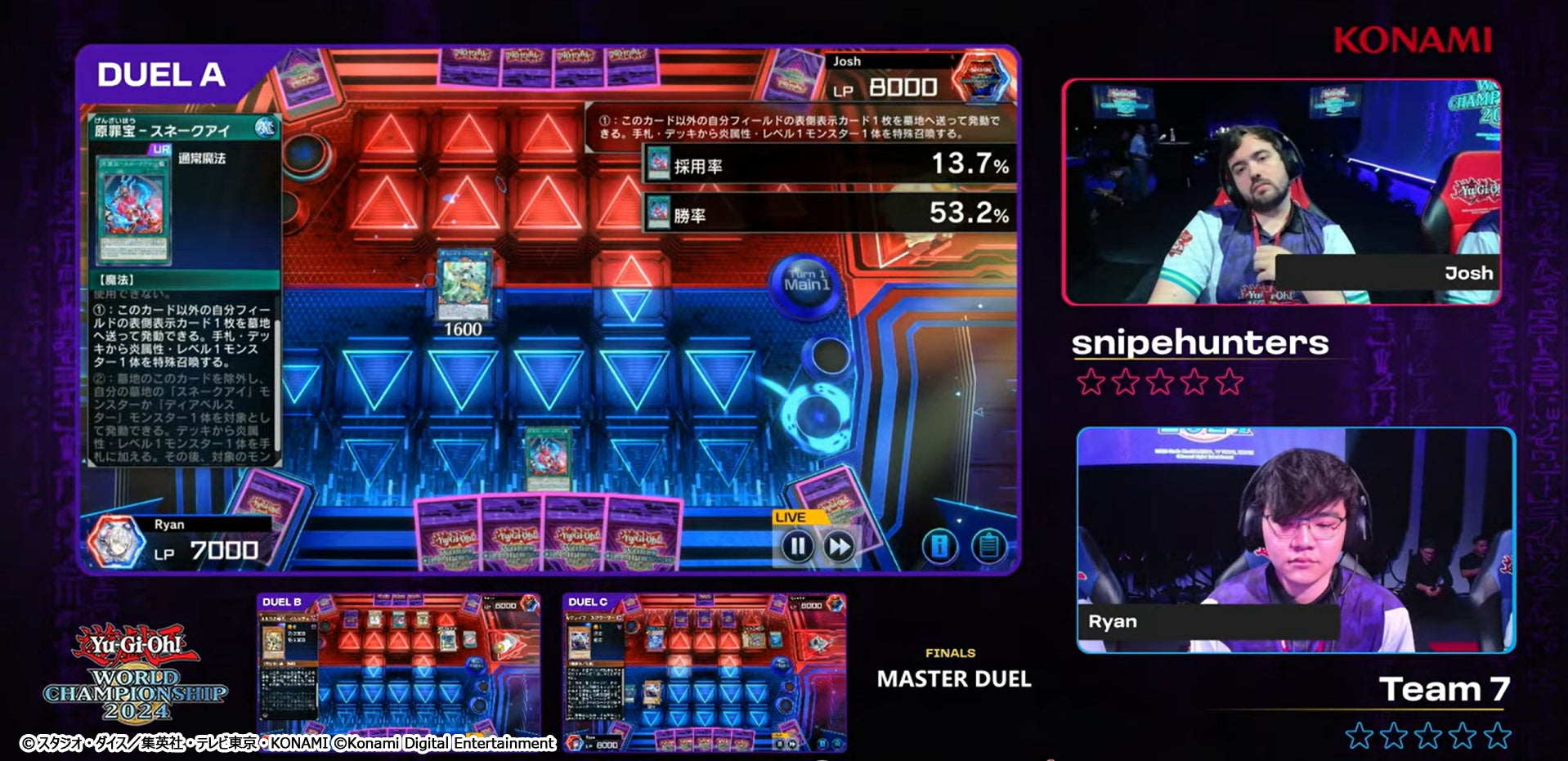 株式会社コナミデジタルエンタテインメントは、遊戯王カードゲームの世界トップデュエリストを決めるeスポーツ世界選手権「Yu-Gi-Oh! World Championship 2024」(WCS2024)の決勝戦を2024年9月8日(日)にアメリカ・シアトルで開催し、 「オフィシャルカードゲームの部」、「デュエルリンクスの部(スピードデュエル)」、「デュエルリンクスの部(ラッシュデュエル※)」、「マスターデュエルの部」の優勝者・チームが決定したことをお知らせします。