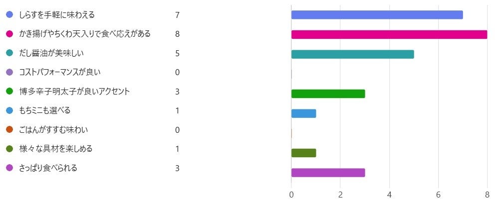 最も多くの票を集めたのは『かき揚げやちくわ天入りで食べ応えがある』というポイントでした。以下2位は『しらすを手軽に味わえる』、『だし醤油が美味しい』でした。