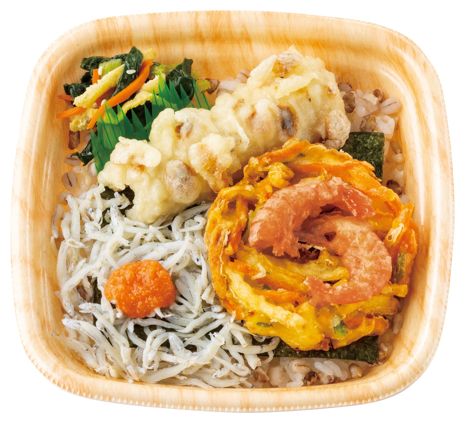 『釜揚げしらす弁当』は、あたたかいごはんの上に、ふっくら食感の国産しらすと、天然えびのかき揚げ、ちくわの天ぷら、博多辛子明太子など、こだわりの具材を盛り込んだ、海鮮を堪能できるメニューです。