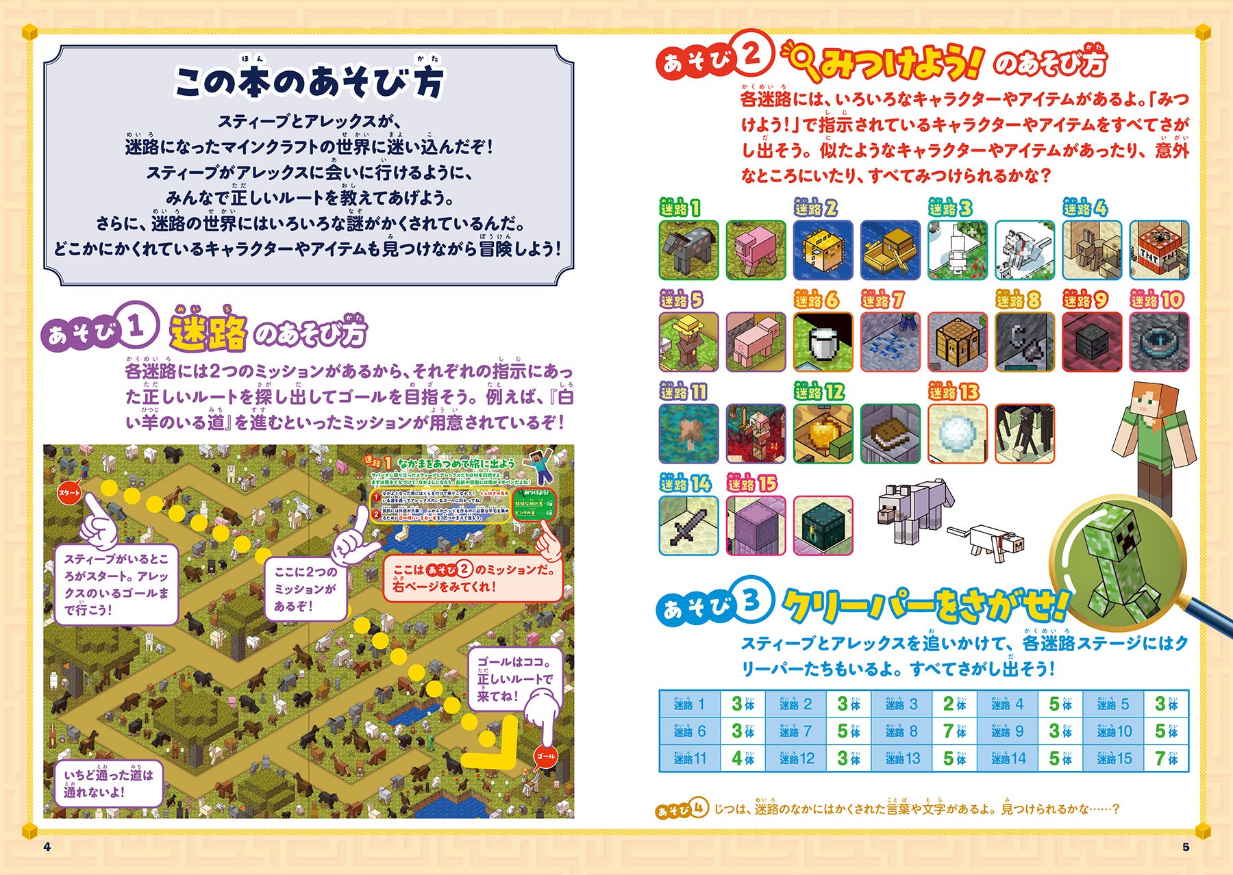 本書は、マインクラフトの世界を舞台に、エンダードラゴンを倒すという目的を果たすべく15種類のステージ(迷路)をクリアしていく、じっくり遊べる迷路ブックです。それぞれの迷路に2つのミッションが設定されており、それらの指示にあった正しいルートを探し出す必要があります。さらに、すべての迷路に特定のキャラやアイテムを見つける絵探しも用意されているほか、迷路のどこかにクリーパーや秘密の文字が隠れているとか……? 一筋縄ではいかない難易度で何度も楽しめるおトクな1冊になっています。