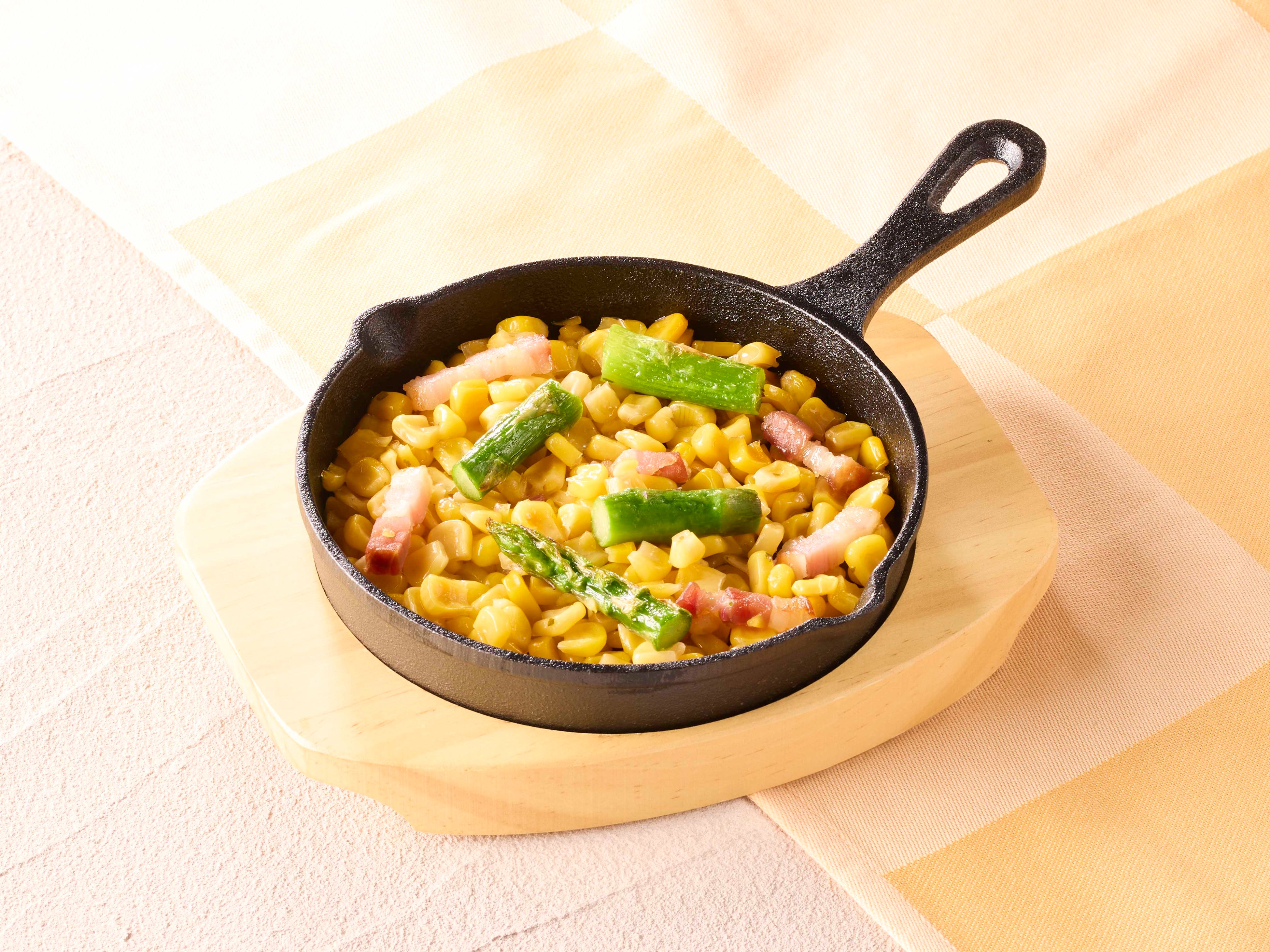 ほんのり香るガーリックがアスパラガスの爽やかな風味やスイートコーンの甘みを引き立て、食欲をかき立てます。