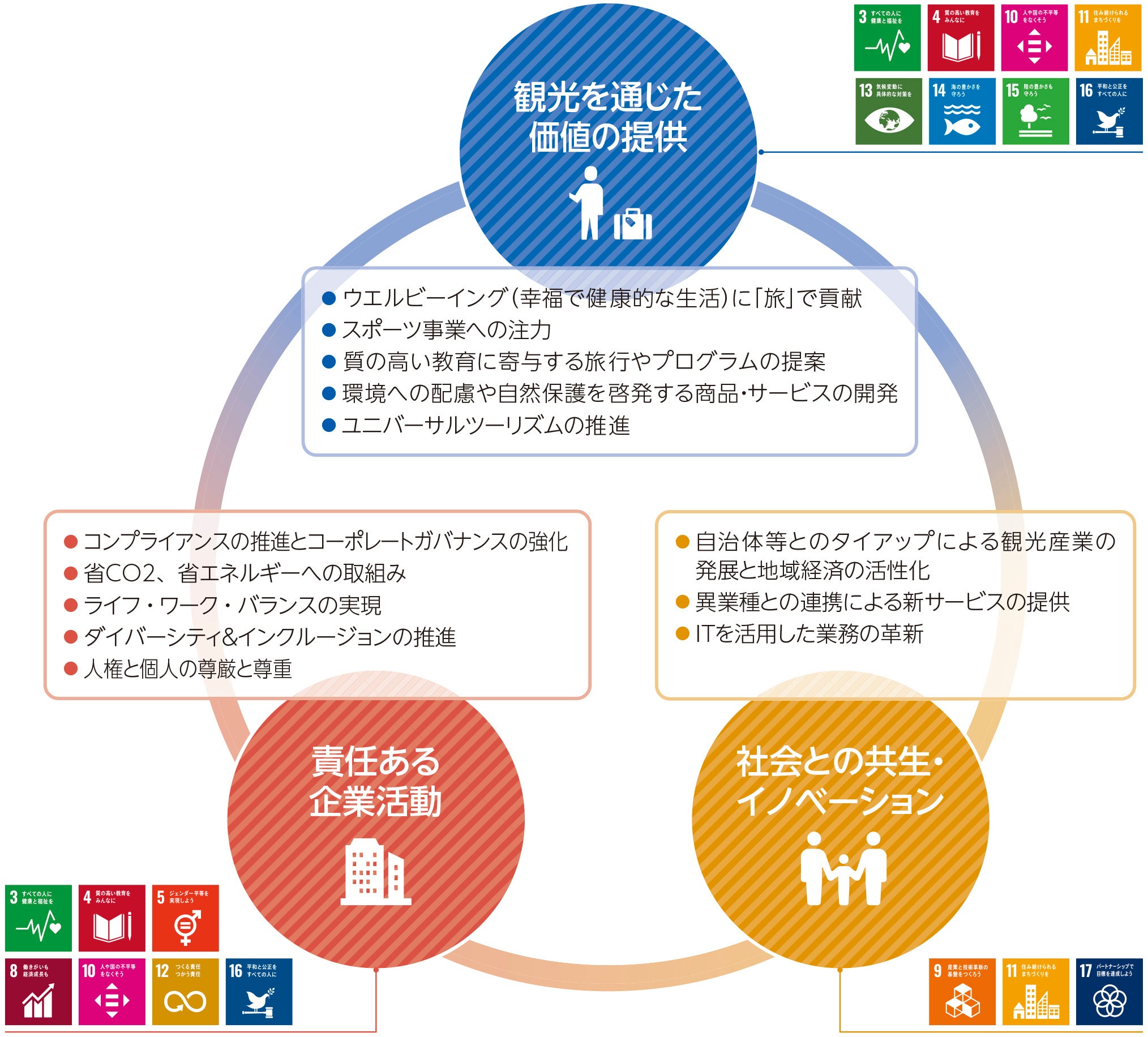 当社グループでは、「旅」が人生を豊かにするだけではなく、例えば自然豊かな地域に旅行することで、山、海、自然の大切さに触れ、地球環境の重要性の再認識に繋がったり、「旅」が健康の増進に様々な点で役立ったりすることに着目し、SDGsのマテリアリティ(重要課題)の一つとして「観光を通じた価値の提供」を掲げました。「責任ある企業活動」、「社会との共生・イノベーション」とともに、この課題に取り組んでまいります。