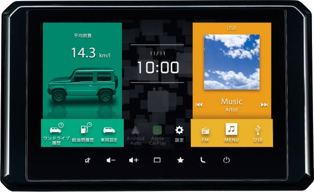 今回、安全機能と快適装備がさらに充実した「ジムニー」「ジムニーシエラ」は、日常生活からレジャー用途まで幅広く活躍するスズキを代表するコンパクトクロスカントリー4WDです。同車両に採用されたディスプレイオーディオは、ダッシュボードの形状に合わせたフレームデザインの9インチ高精細HDディスプレイ搭載モデルで、ラジオやBluetooth®接続など多様なメディア再生のほか、スマートフォンと連携させる「Apple CarPlay」「Android AutoTM」に対応する地図アプリの表示も可能です。また、「車両情報」と「オーディオ」が分かれたエリア表示で多彩な機能を簡単に操作でき、カスタマイズも可能なホーム画面を採用しています。さらに、スズキコネクトのサービスと連携することで、画面上への通知表示や、スズキトラブルサポートへの発信操作を行えます。