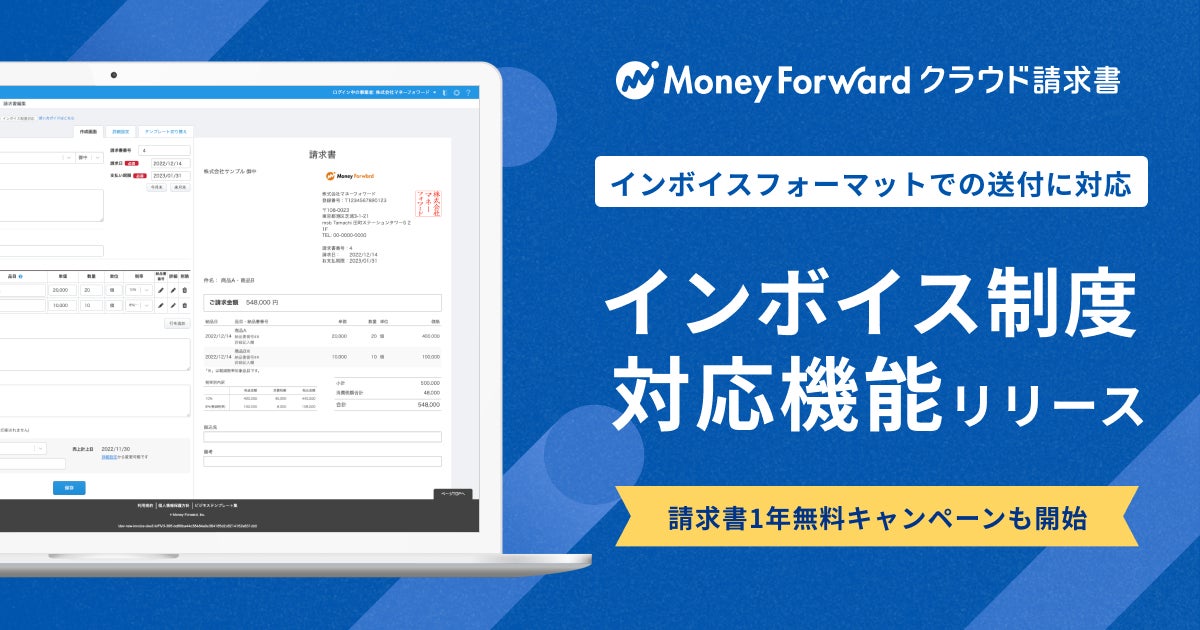 株式会社マネーフォワードは、請求書管理ソフト『マネーフォワード クラウド請求書』において、インボイス制度に対応した請求書の発行・送付が可能になる「インボイスフォーマット」の機能提供を開始しました。この度の機能提供に合わせて『マネーフォワード クラウド請求書』※が1年間無料で利用できる「インボイス対応応援キャンペーン」も開始します。