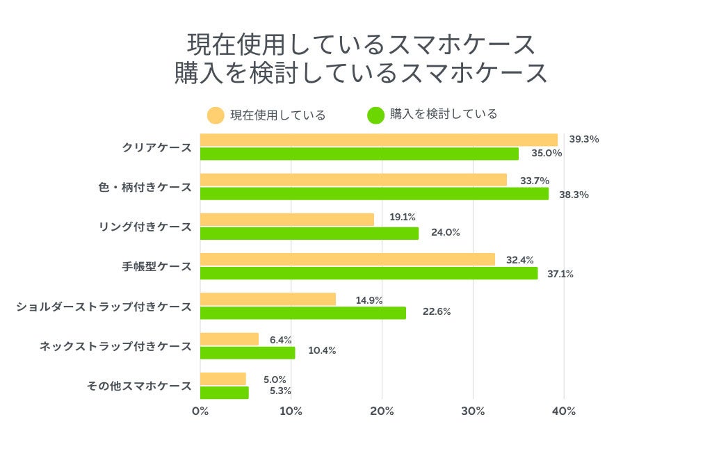 アンケートでは、「ケース型(クリア)」「ケース型(色・柄付き)」「リング付きケース型」「手帳型」「ショルダーストラップ付きケース」「ネックストラップ付きケース」6種類のスマホケースで現在使用しているタイプ、購入検討しているタイプを調査しました。