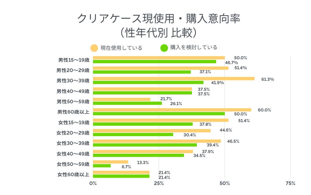 1番割合が高いのは「男性30~39歳」で 61.3%、次いで「男性60歳以上」が60.0%。一方で、「男性15~19歳」の使用率が50.0%、「女性15~19歳」は51.4%となり若年層にも使用されていることから、クリアケースが幅広くどの年代からも支持を集めていることが伺えます。