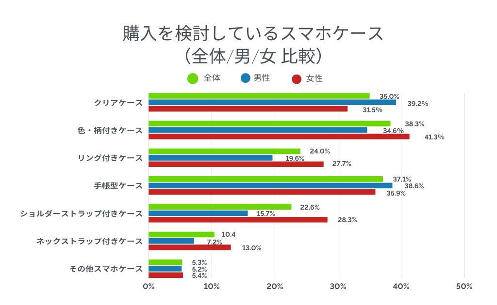 代わりに、女性は「色・柄付きケース」41.3%、「ショルダーストラップ付きケース」28.3%、「リング付きケース」27.7%などが、全体の平均値よりも高い結果になりました。