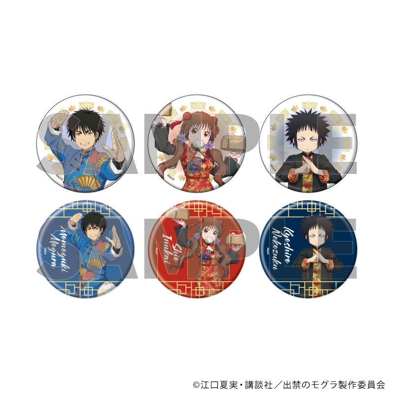 直径約5.7cmの缶バッジ。上半身にクローズアップしているので、モグラの得意げな笑顔、桃饅頭をくわえた犬飼詩魚の愛らしいお顔、猫附梗史郎のきりっとした表情をじっくり眺められます!