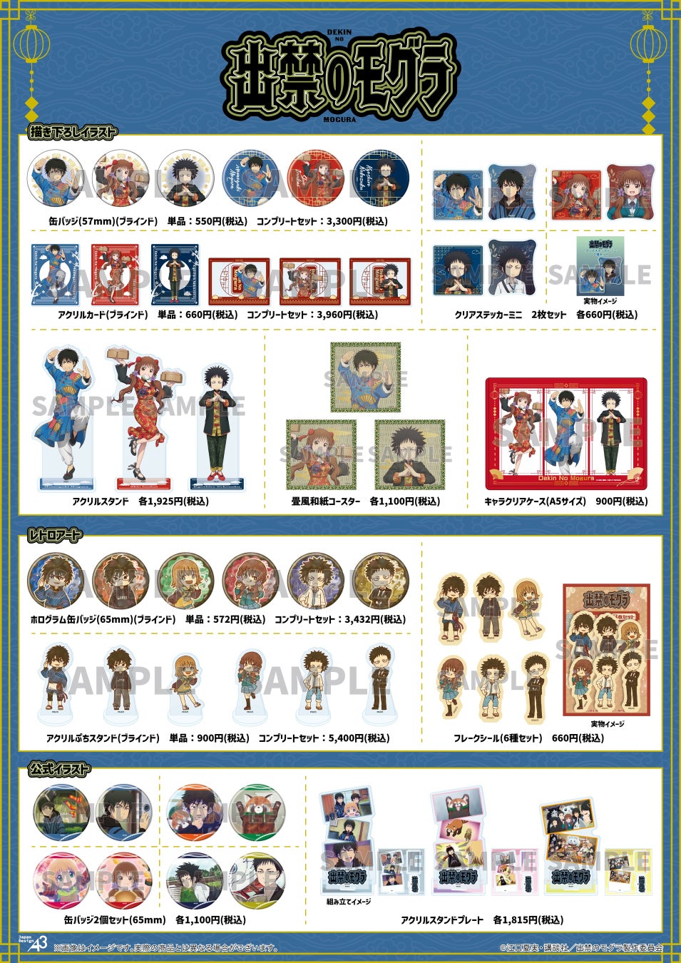 新作グッズには、“チャイナ風衣装”を着たモグラ、犬飼詩魚、猫附梗史郎の描き下ろしイラストをはじめ、レトロアートやアニメ公式イラストを使用したアイテムも登場! 日常使いにもコレクションするのにもぴったりなラインナップです♪