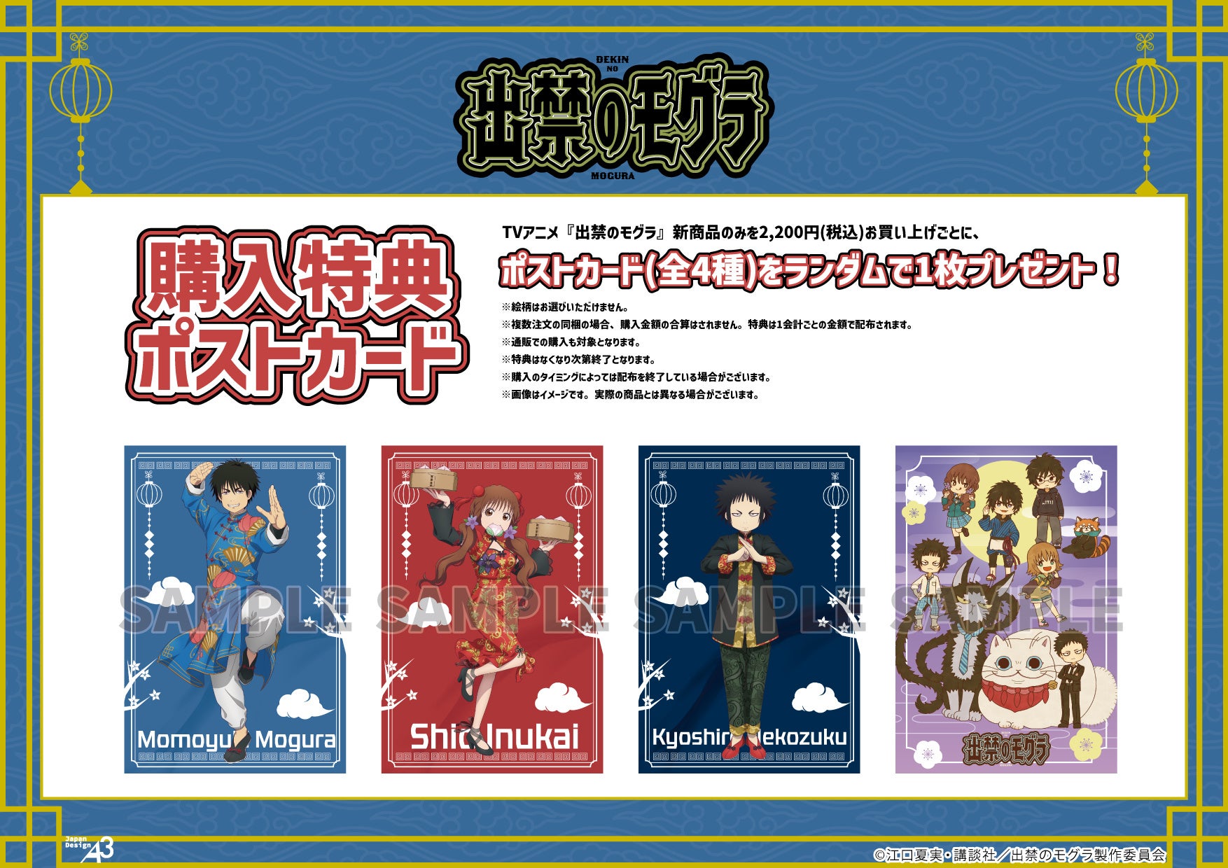 TVアニメ『出禁のモグラ』の新商品のみを2,200円(税込)お買い上げごとに、ポストカード(全4種)をランダムで1枚プレゼントします。